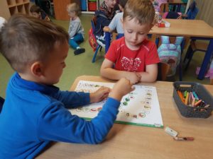 . Nie zabrakło nauki dzielenia słów na sylaby, segregowania oraz przeliczania- w końcu mądre z nas Sowy