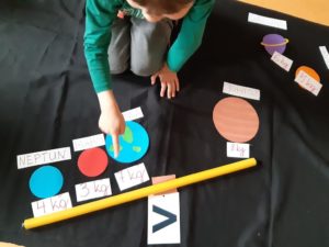 , pokusili się także o “zważenie” planet w naszym układzie słonecznym oraz o podział ich na części pod kątem symetrii. Musieliśmy zapamiętać ciąg cyfr, dzięki którym mogliśmy się dostać do naszej “kosmicznej sali”